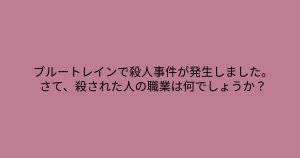 ”◯された人の職業は何、、、?” 問題文をよく読んで解いてみましょう 今回ご紹介するのは脳トレクイズです。 問題 ブルートレインで殺人事件が発生しました。 さて、殺された人の職業は何でしょうか? Google ADVERTISEMENT Google あなたはわかりましたか? それでは答え合わせに行きましょう! Google 答えは、、、「医者」 ADVERTISEMENT ブルートレインとは「寝台車」を指す愛称です。寝台車だけに「死んだ医者」となり、「医者」が殺されました。 ADVERTISEMENT Google あなたは間違えずに解けたでしょうか! Google [著作権者VONVON /無断コピー、無断転載および再配布禁止(違反時の法的措置) ADVERTISEMENT