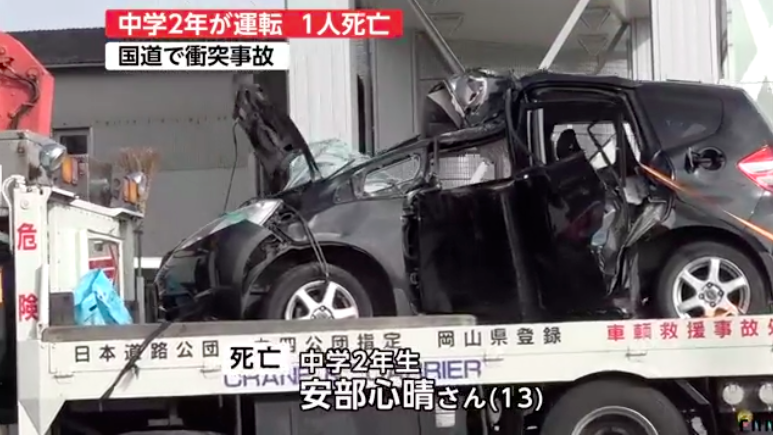 1日午前4時55分頃、岡山市北区青江2丁目の国道30号で中学生が運転していた乗用車に中学2年生計5人が乗っていた乗用車が中央分離帯の支柱に衝突した事故が起きました。車の中にいた安部心晴(こはる)さん(13)が車外に投げ出され、頭を強く打ったことで、搬送された病院で死亡したことが分かりました。その他は3人も足骨折などの重傷、1人は軽傷を負いました。