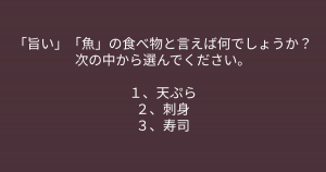 ”1、天ぷら 2、刺身 3、寿司” これがわかったらすごいかも!?あなたには分かりますか? 今回ご紹介するのは脳トレクイズです。 問題 「旨うまい」「魚」の食べ物と言えば何でしょうか? 次の中から選んでください。 1、天ぷら 2、刺身 3、寿司 Google ADVERTISEMENT Google あなたはわかりましたか? それでは答え合わせに行きましょう! Google 答えは、、、「鮨」 ADVERTISEMENT 「魚」に「旨」を加えると、「鮨」と言う漢字になります。鮨だけに、3番の「寿司(鮨)」が答えになります。 ADVERTISEMENT Google あなたは間違えずに解けたでしょうか! Google [著作権者VONVON /無断コピー、無断転載および再配布禁止(違反時の法的措置) ADVERTISEMENT