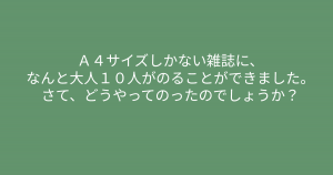 ”A4サイズしかない雑誌に、、、、” 意外と難しいクイズ問題に挑戦! 今回ご紹介するのは脳トレクイズです。 問題 A4サイズしかない雑誌に、なんと大人10人がのることができました。 さて、どうやってのったのでしょうか? Google ADVERTISEMENT Google あなたはわかりましたか? それでは答え合わせに行きましょう! Google 答えは、、、「写真として載った。」 ADVERTISEMENT A4サイズの雑誌の上には、物理的に10人が乗ることは不可能ですが、写真としてなら載ることは可能です。 ADVERTISEMENT Google あなたは間違えずに解けたでしょうか! Google [著作権者VONVON /無断コピー、無断転載および再配布禁止(違反時の法的措置)] ADVERTISEMENT