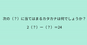「2(?)ー(?)=24」 この問題が解けた人はかなり柔軟な考えの持ち主かも!? 今回ご紹介するのは脳トレクイズです。 問題 : 次の(?)に当てはまるカタカナは何でしょうか? 2(?)ー(?)=24 Google ADVERTISEMENT Google あなたはわかりましたか? それでは答え合わせに行きましょう! Google 答えは、、、「ダ ス(2ダース=24)」 ADVERTISEMENT 1ダースは12なので、「2ダース=24」になります。 Google あなたは間違えずに解けたでしょうか! ADVERTISEMENT Google [著作権者VONVON /無断コピー、無断転載および再配布禁止(違反時の法的措置)