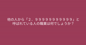 ”「2.99999999999」” 簡単そうで難しいクイズ問題に挑戦しましょう 今回ご紹介するのは脳トレクイズです。 問題 他の人から「2.99999999999」と呼ばれている人の職業は何でしょうか? Google ADVERTISEMENT Google あなたはわかりましたか? それでは答え合わせに行きましょう! Google 答えは、、、「保母さん」 ADVERTISEMENT 「2.99999999999」は、「ほぼ3」ですので、「保母さん」が答えになります。 Google あなたは間違えずに解けたでしょうか! ADVERTISEMENT Google [著作権者VONVON /無断コピー、無断転載および再配布禁止(違反時の法的措置)]