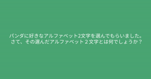 ”パンダに好きなアルファベット2文字を、、、” 問題文をよく読んで解いてみましょう 今回ご紹介するのは脳トレクイズです。 問題 パンダに好きなアルファベット2文字を選んでもらいました。 さて、その選んだアルファベット2文字とは何でしょうか? Google ADVERTISEMENT Google あなたはわかりましたか? それでは答え合わせに行きましょう! Google 答えは、、、「PとA」 ADVERTISEMENT パンダを英語にすると、「PANDA」になります。PANDAだけに、「P AND A」を選びました。 Google ADVERTISEMENT あなたは間違えずに解けたでしょうか! Google [著作権者VONVON /無断コピー、無断転載および再配布禁止(違反時の法的措置)] ADVERTISEMENT