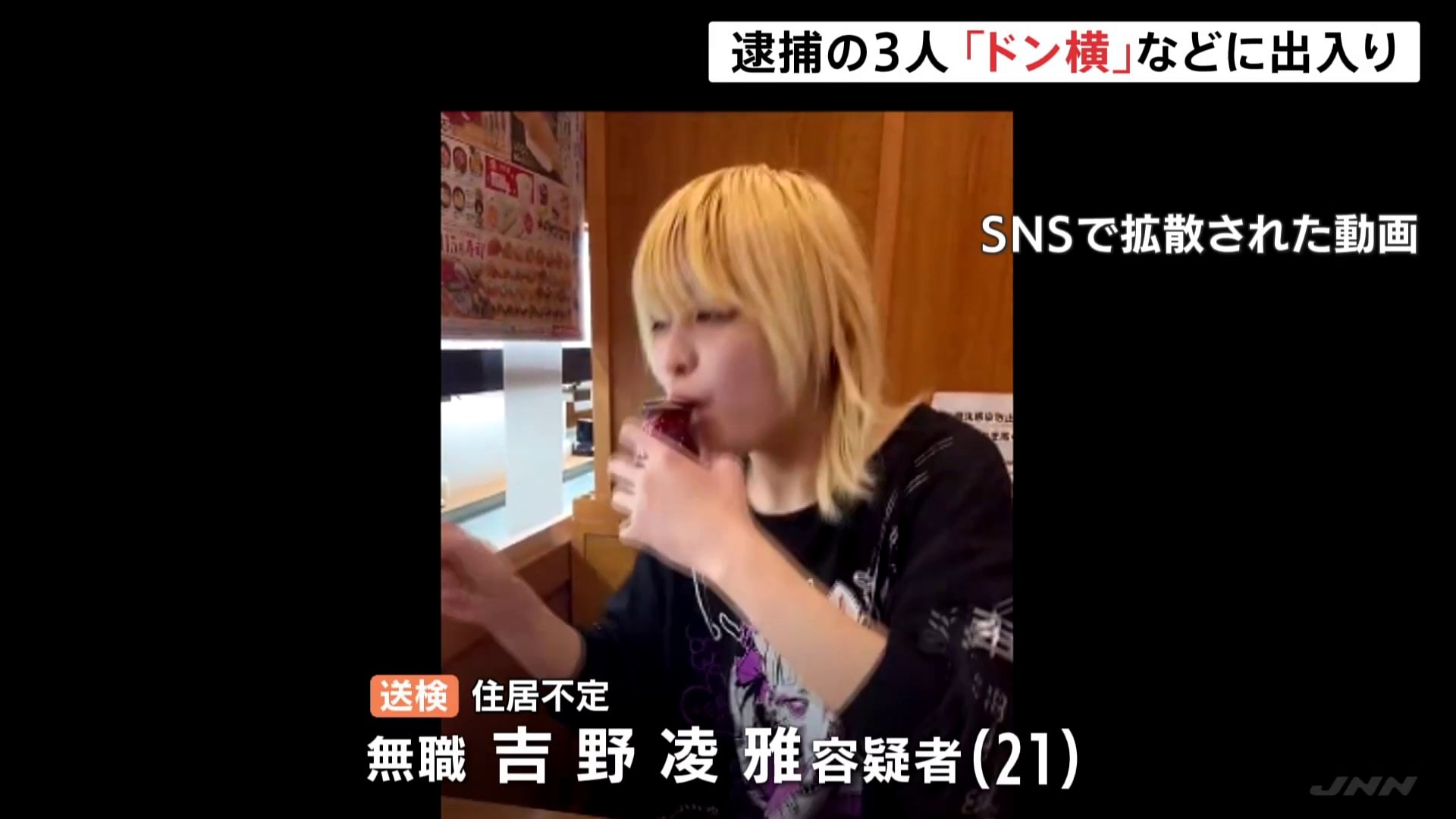 警察によりますと、3人は名古屋市中区にある「くら寿司名古屋栄店」で、吉野容疑者が醤油さしの注ぎ口を口に付ける様子を少年が撮影してSNSに投稿し、店の業務を妨害した疑いが持たれています。