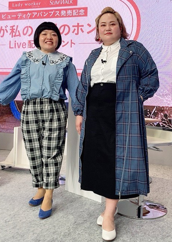 ゆいPさんはブルーチェックのライダースコートに黒タイトスカート、白のパンプス姿。相方のオカリナさんはブルーの切り替えブラウスにチェックパンツ、青のパンプス姿で統一感のあるリンクコーデを披露。