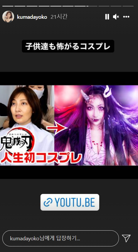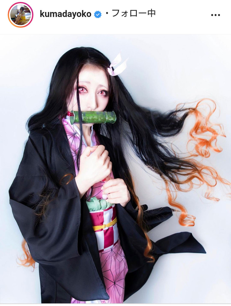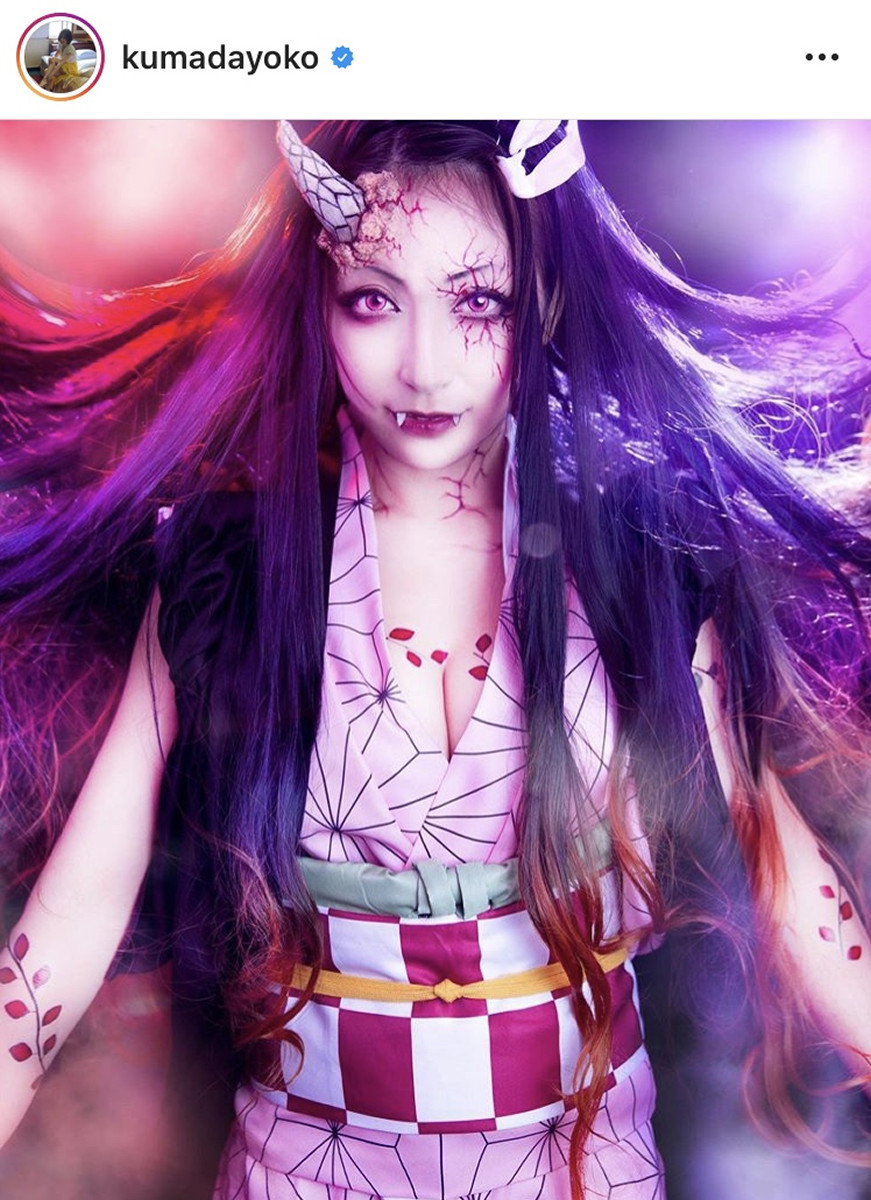 熊田さんは「今年のハロウィンの衣装決まった? 38歳コスプレしまくり」と綴り、「子供達も怖がるコスプレ」と特殊メイクで人気漫画・毀滅刃の禰豆子に変身した姿を披露したのでした。