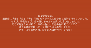 ある学校では、運動会に「赤」「白」「青」「緑」の4チームに分かれて競争を行っていました。ですが、子供たちが、色で分けるなんて古臭いと言い出しました。