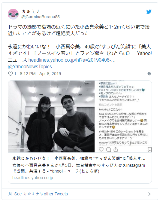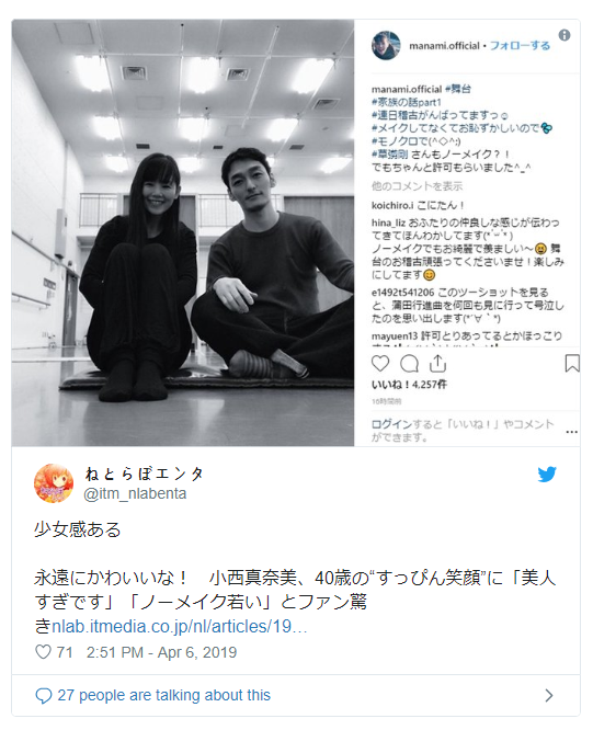 女優の小西真奈美はアラフォーですが、現在もとても可愛いですよね。そんな中、自身のinstagramで最近、舞台稽古中のすっぴんショットを公開し「可愛い!」と反響を呼んでいるようです。あの草〇ぎ剛を目の前にしてもすっぴんでいられるということは、相当の美人さんなんでしょうね!