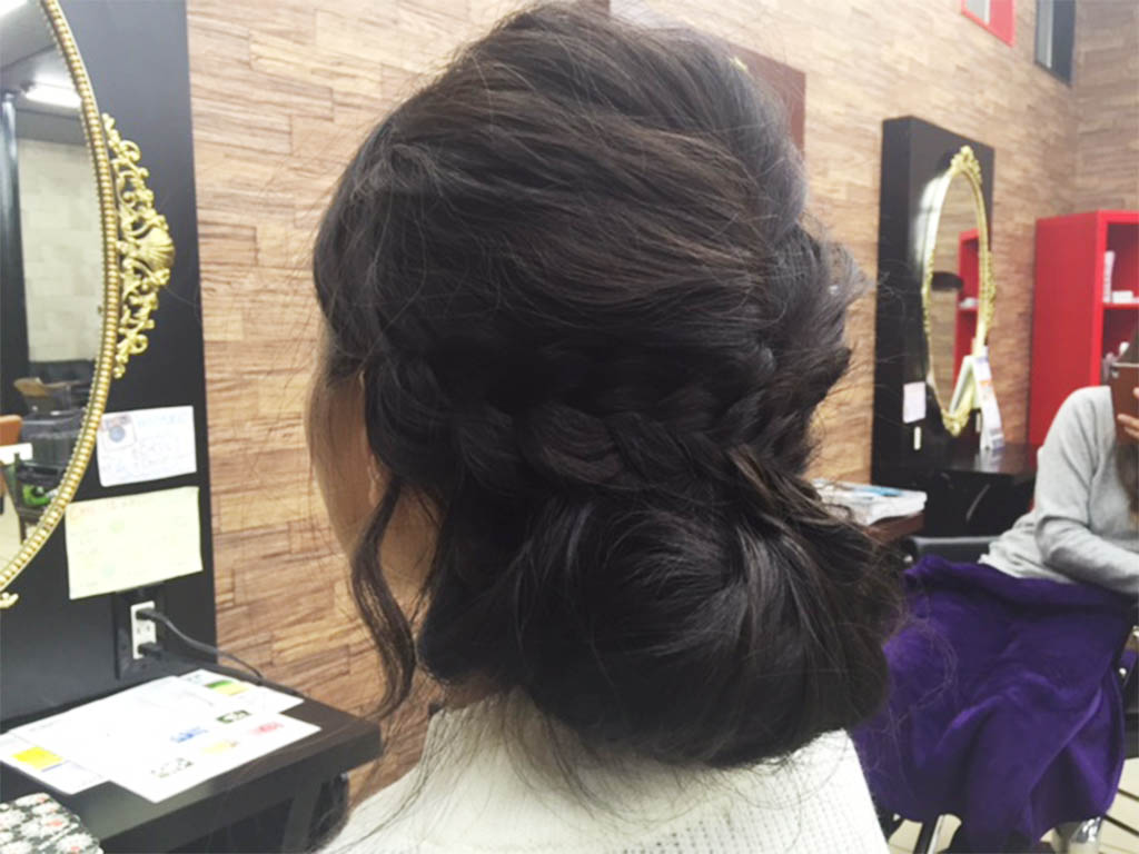 アップスタイルも三つ編みを使えば簡単にでき、時間が無いときにも便利なアレンジです。髪の毛をざっくりふたつに分けて、分け目がハッキリしないように分けます。ふたつに分けた毛束を三つ編みをしてゴムに留めて、反対側も同じように三つ編みをします。三つ編みを反対側に持っていくように、逆サイドの耳の後ろにピンで固定します。反対側も同じように、逆の耳の後ろにピンで固定します。余っている毛先があれば、それも折り返して耳の後ろに固定しておきます。三つ編みをする時間が無いときには、ツイストで同じようにアレンジすると凝った髪型に見せることも出来ます。