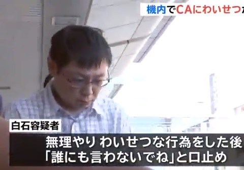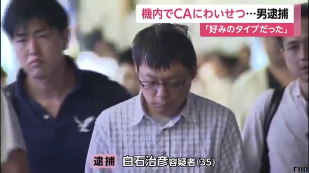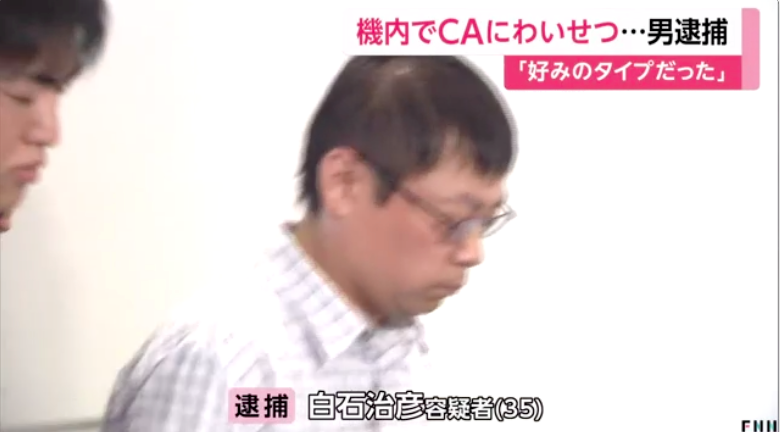 今回の事件の内容は、白石容疑者が「腹が痛いので、薬が欲しい」と客室乗務員にいいトイレに行ったあと、薬と水を持ってきたくれた客室乗務員に対し、「不倫に興味ない」などと声をかけ、胸や尻を触ったということです。警察の調べに対し、白石容疑者は容疑を認めているとのことです。