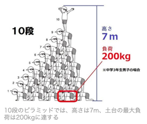 ピラミッドは10段という学校もありましたが、一番下の段の生徒の負荷は200キロにも及ぶといいます。