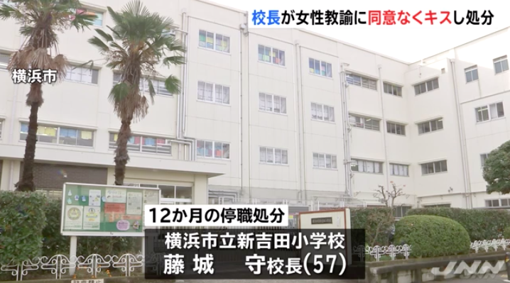 横浜市教育委員会は23日、別の小学校に勤務する30代の女性教諭に無理やりキスをしたなどとして、市立新吉田小の藤城守校長(57)を停職12カ月の懲戒処分にしました。校長は同日付で依願退職しました。