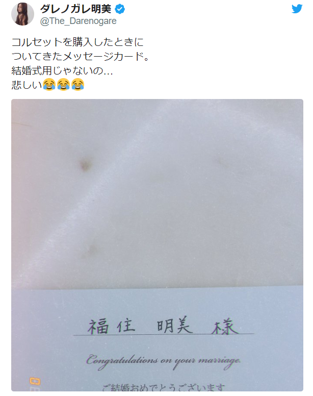 カードには「福住 明美様」の宛先で「ご結婚おめでとうございます」と記されている。思わぬ祝福に ダレノガレは「結婚式用じゃないの…悲しい」と複雑な心境をつづっていました。