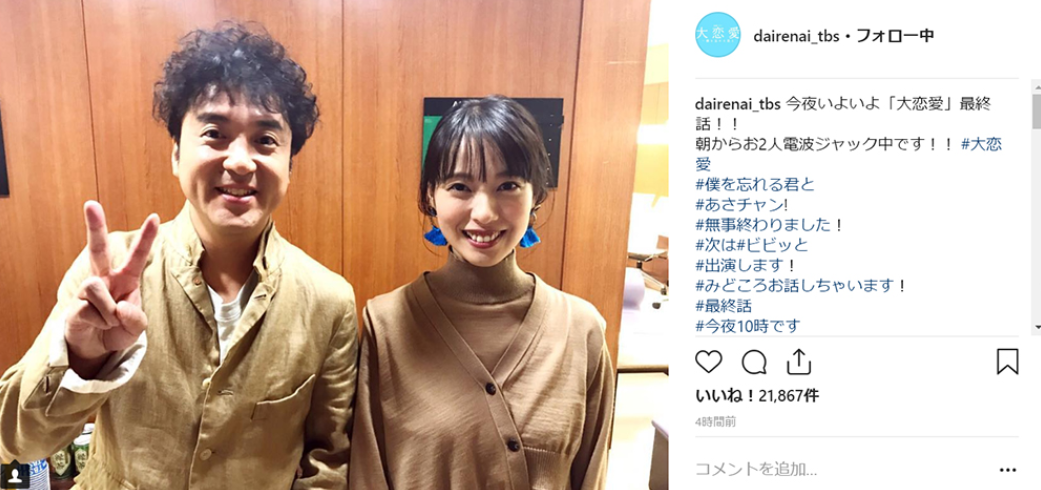 ムロさんも、慣れない恋愛ドラマへの出演に不安があったことを告白しつつ、「恵梨香ちゃんはじめスタッフのみなさんに助けていただきました。本当に、本当に、自分の代表作のひとつとさせてください。本当にやりがいのある3カ月半でした」と共演者やスタッフに感謝の言葉を贈りました。「大恋愛」予告を二人が制作した動画もほほえましいので是非ご覧ください!