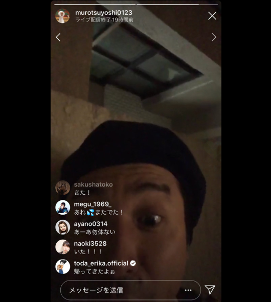 その後、数人のファンから戸田さんが来ていたことを聞いたのか、慌てて再びライブ配信をスタートしたムロさん。