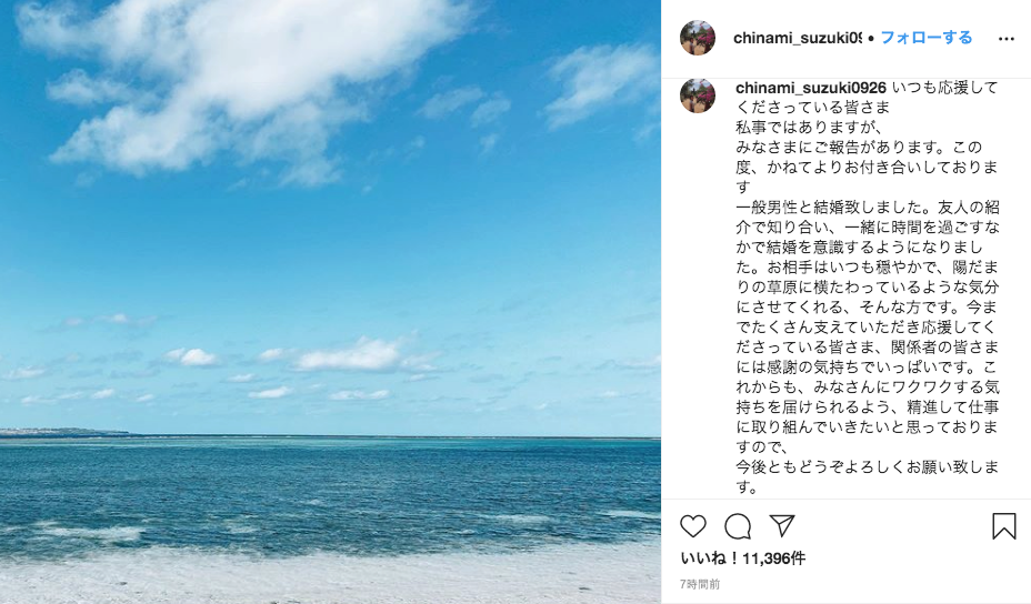 そういった鈴木ちなみさんは11日、「いつも応援してくださっている皆さま」と自分のインスタグラムとブログを更新、結婚のことを発表しました!