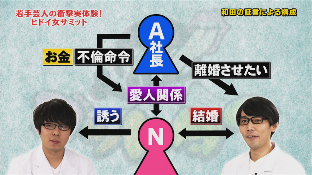 ここで、騒動の流れを説明することになりました。あくまで和田貴志さんの憶測によるものですが、今回の事件は、東ブクロさんと元妻以外にも、彼女が所属する事務所の社長が関わっていると語ります。どうやら社長は、元妻に好意を持っており、彼女と結婚する和田貴志さんに怒りを覚えていました。そこで、2人を離婚させるため、元妻に「東ブクロとホテルに行って、写真を撮れば10万円をあげる」と指示を出したのではないか……と推理しました。