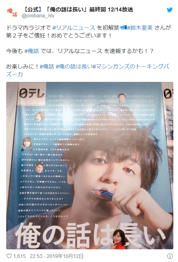 鈴木さんは 2019年10月12日にドラマ『俺の話は長い』(日本テレビ系)で 劇中ドラマを通じて 異例の出産発表を行い、話題になっていました。