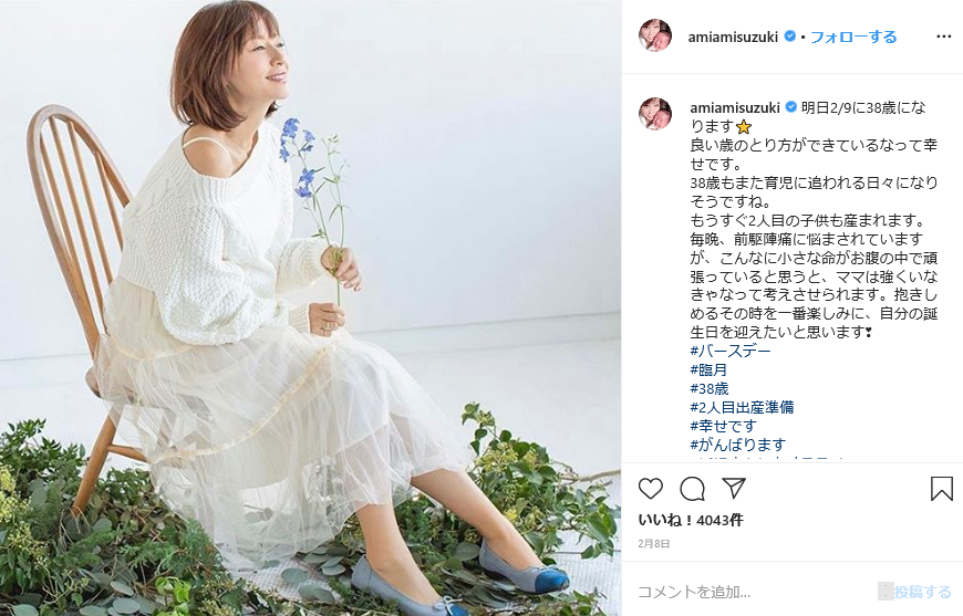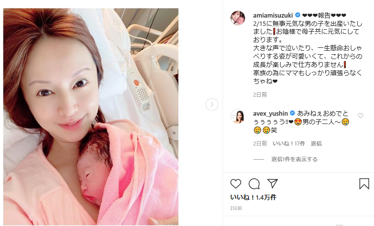 鈴木さんのインスタグラムにはタレントのゆしんさんからの「あみねぇおめでとぅぅぅぅう 男の子二人」というコメントをはじめ、多くの人々から祝福のメッセージが寄せられています。