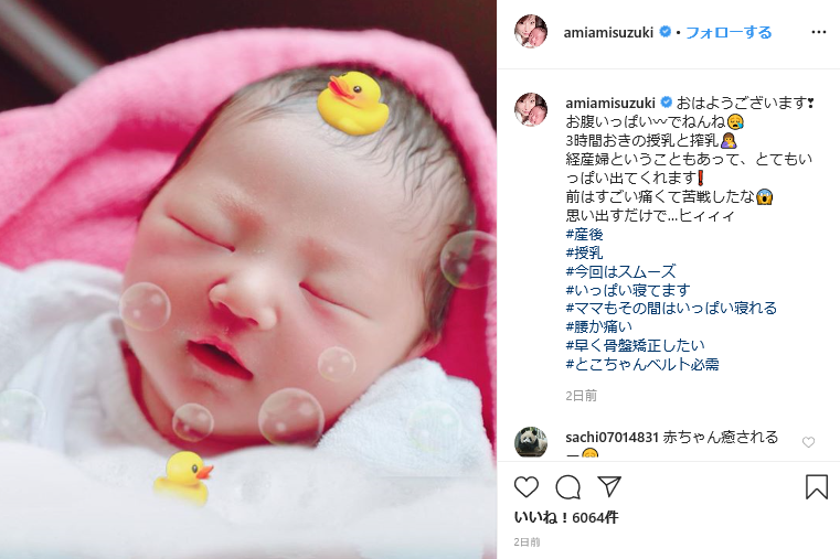 生まれたばかりのかわいい赤ちゃんが寝ている顔写真をアップして、「3時間おきの授乳と搾乳 経産婦ということもあって、とてもいっぱい出てくれます」と授乳が順調であることも告白しました。
