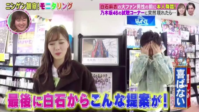 白石さんがサプライズを仕掛けるのは、仕掛け人の妻に連れられてやってきた、6年前から白石の大ファンという男性。店内に特設された乃木坂46の 試聴コーナーで男性が曲を聴きはじめたところで、妻がトイレを口実にその場を離れ、1人になった男性の前に白石さんが現れました。しばらくは 隣にいる白石さんに気づかなかった男性だが、一度白石さんの方を向くとすぐにまさか、という表情になり、固まってしまいました。