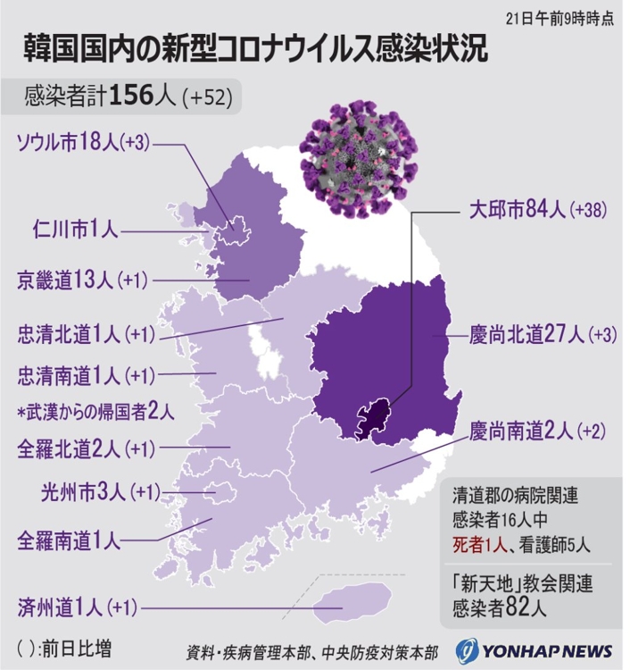 韓国政府は21日、新型コロナウイルスについて、新たに52人の感染が確認され、韓国での感染者数が計156人になったと発表しました。韓国政府は同日、新たな感染者が集中している南東部の大邱(テグ)市と慶尚北道(キョンサンプクト)清道(チョンド)地域を感染症の「特別管理地域」に指定し、重点的な防疫措置を取る方針を決めました。