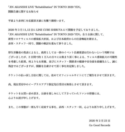 赤西さんが主宰する自主レーベル「Go Good Records」のSNSで明かされたもので、新型コロナウイルスの感染拡大や政府からの注意喚起を踏まえた上で、赤西本人とスタッフが対策を検討したという。