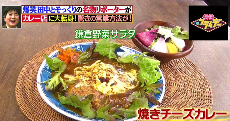 人気の「焼きチーズカレー」(写真=鎌倉野菜のサラダ付き1000円)はバーナーで焦がしたチーズがのっており、混ぜ混ぜすると奥行きある風味を楽しめます。特製ルーは、豚骨・鶏ガラ・香味野菜などを6時間煮込んだスープに数種類のスパイスを合わせて作り、さらに少し煮て一晩寝かせているという。ガツンとした辛さではなく、後でピリリと効いてきます。