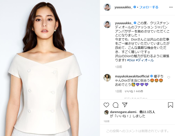 という「クリスチャン ディオール・ファッション ジャパン アンバサダー」任命の報告が 26日には、インスタグラムに UPされて こちらにも 多くの祝福コメントが 寄せられているようでした。