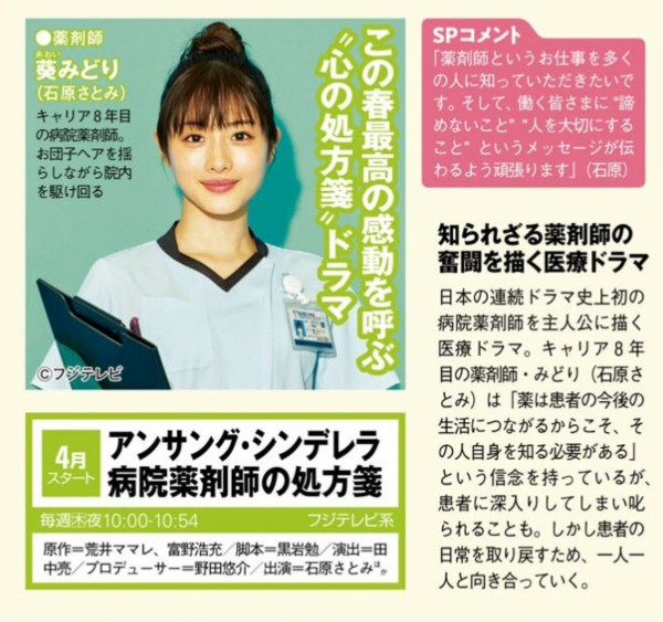 石原さとみさん主演のドラマ『アンサング・シンデレラ 病院薬剤師の処方箋』(フジテレビ系)が 4月にスタートしますが…。