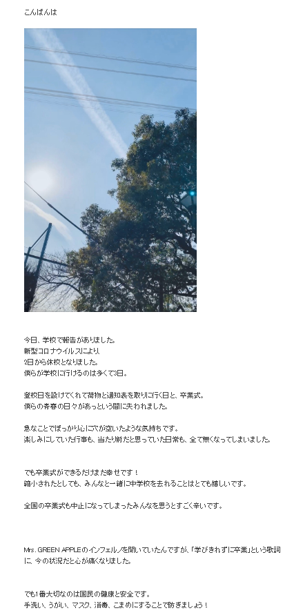 「でも卒業式ができるだけまだ幸せです!縮小されたとしても、みんなと一緒に中学校を去れることはとても嬉しいです」と伝え、卒業式すら中止になった学校の生徒の心境を思い、「すごく辛いです」と記しました。