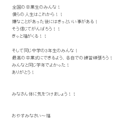 「全国の卒業生のみんな!僕らの人生はこれから!!嫌なことがあった後にはきっといい事がある!そう信じてがんばろう!!きっと福がくる!!」とメッセージを送っています。