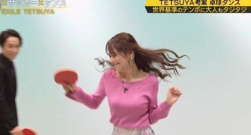 鷲見アナも笑顔で曲に合わせながら体を揺らしていき、ダンスを披露することに!すると…、テレ東屈指の推定Fカップともいわれる爆乳がユサユサとうごめいていく場面が!