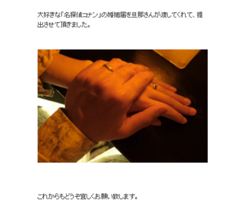 また、婚姻届と結婚指輪の写真を添え「大好きな『名探偵コナン』の婚姻届を旦那さんが渡してくれて、提出させて頂きました。これからもどうぞ宜しくお願い致します」と結びました。