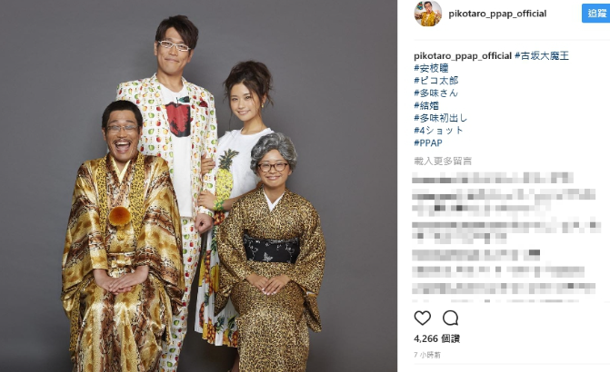 4年3カ月の交際期間を経て、「ペンパイナッポーアッポーペン(PPAP)」で大ブレークした歌手「ピコ太郎」に扮(ふん)した古坂大魔王(44)がタレント安枝瞳(29)と結婚しました。