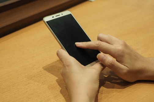 スマホのリズムゲームを舌を使って攻略する女性