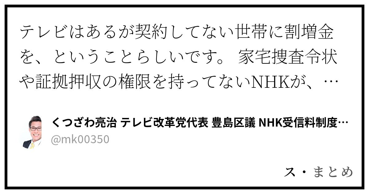 「 TBSの社長が、受信料問題について『NHKは国民や視聴者から本当に理解を得ているのか』と、コメントしましたが、民放の人間はもうカンカンですよ。ただでさえテレビ離れが すごいスピードで進んでいるのに、未払い者に割増金まで課したら、若者はいよいよテレビを捨てるでしょう。そうなれば もうテレビは完全にオワコンです。局員の中には、『もう1回、“N国”(NHKから国民を守る党)が復活してくれないかな』なんて言っている人間もいますよ…」