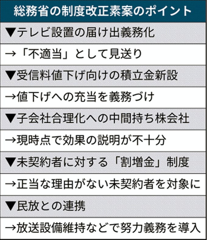 未払いを防ぐため、テレビ設置の有無を届け出るよう義務付ける制度や、未契約者の個人情報を照会できる制度の導入を求めるよう 総務省の有識者会議では提案。これらは見送られる方針となりましたが、その代わりに、支払いを逃れている者には 割増金を課す制度を導入するように求めていくという。