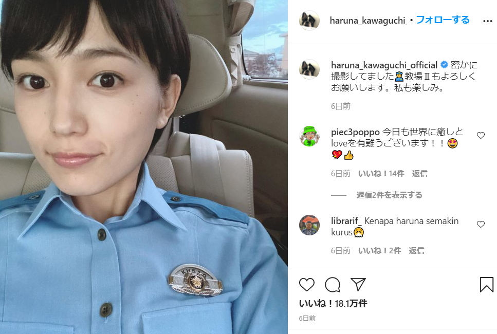 2020年11月26日、女優の川口春奈さんがインスタグラムを更新。前作『教場』に引き続き、来年1月3、4日に放送される『教場II』(フジテレビ系)への出演を告知し、ショートカットの警官制服姿を披露しました!!