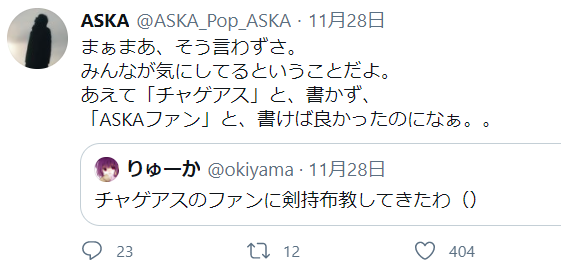 さらにその後、一般人のユーザーが「チャゲアスのファンに剣持布教してきたわ」(剣持はバーチャルユーチューバーのこと)とツイートすると、ASKAさんは一般人に絡み始めたのです。