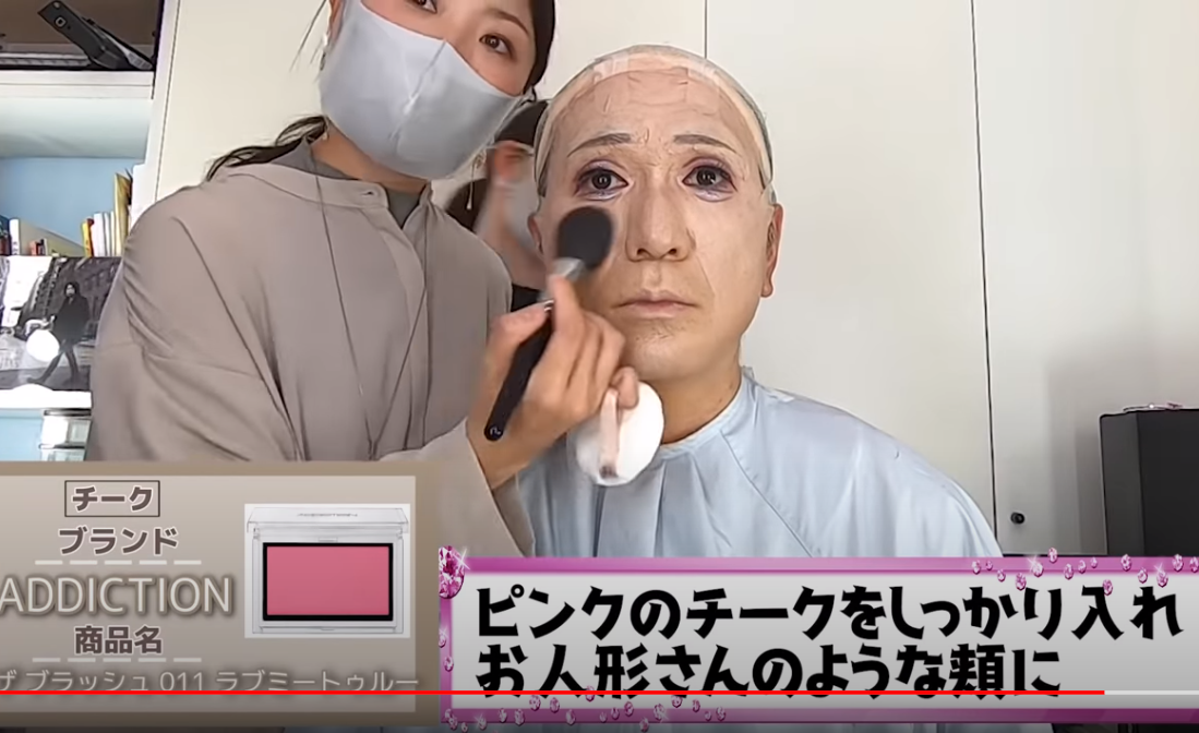 前回に引き続き、江頭さんから 絶大な信頼を得ているスタイリストさんは、つぶらな瞳を演出するコンタクトを入れたり、テーピングで 目の下のたるみやほうれい線を引き上げ、眉消しテープを張り付けた後、オレンジのコンシーラーでヒゲの色味を消し、黄色のコンシーラーで赤見を消して… お人形のような見た目になるよう、ピンクのアイシャドーやチークを念入りに塗布していくと…。
