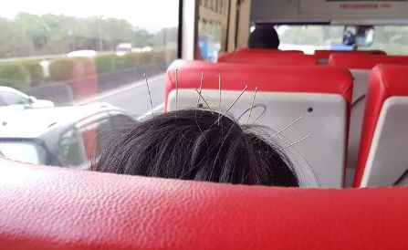 見た感じ、頭の針は結構太いように思えますが、刺さっていても気づかないのでしょうか。頭の針は9本であることが確認できますが、病院側も抜くことを忘れてしまったのかと思うと少々信じられませんね。その後、前の席の乗客は何事もなかったかのようにバスを降りたようです。