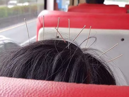 とある海外の病院にて針治療を受けた患者が、頭の針を抜き忘れたまま帰宅した姿がSNS上に話題になっています。当時、バスに乗っていた客が前の席に座っている乗客の頭を見てビックリ。頭には数本もの針が刺さっていました。実際の写真がこちらです。