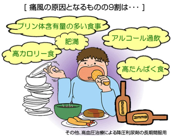 痛風は尿酸が体の中にたまり、それが結晶になって激しい関節炎を伴う症状になる病気です。