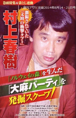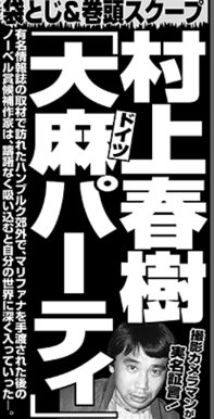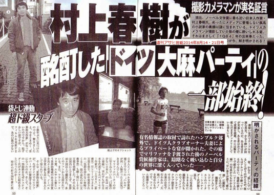 これを報じているのは、「アサヒ芸能」。「村上春樹が酩酊した「ドイツ大麻パーティ」の一部始終」と題し、大麻に酔いしれていると思しき春樹の姿を写した写真を袋とじの巻頭にてカラーで掲載しているほどでした。