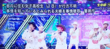 テロップには「都内に住む女子高校生(18)が行方不明 事情を知っているとみられる夫婦を事情聴取 警視庁」と映され、28日から行方不明になっている女子高校生の事情を知ると思われる群馬県在住の夫婦に事情聴取を行ったというもの。