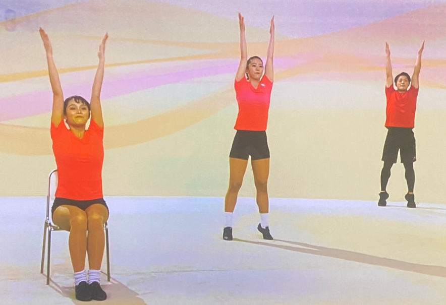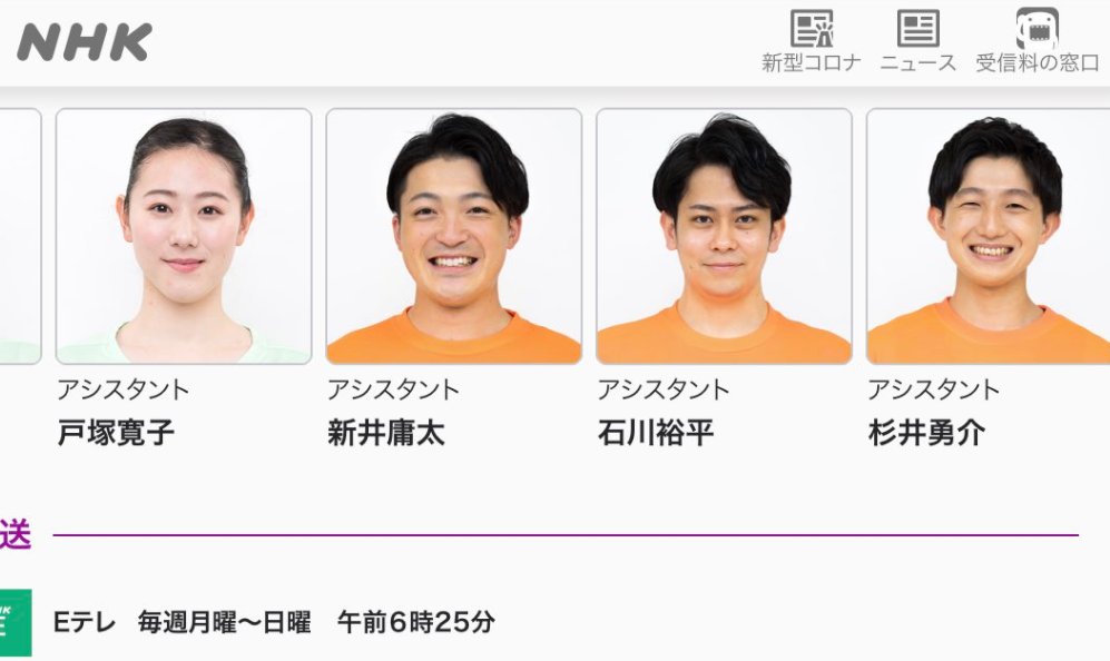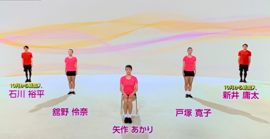 これまでは数名の女性アシスタントがピアノの生演奏に合わせ、体操の実技をする内容でしたが、1日から新たなアシスタントとして、大学体操部の選手3人の男性がメンバーに加わりました。