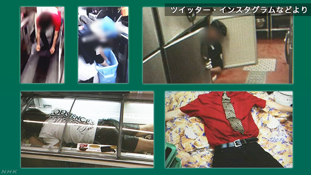「’13年には人気宅配ピザ店のスタッフがピザ生地を顔に貼り付けた写真をSNSに投稿したり、コンビニや飲食店の店員が冷蔵庫に入る様子をSNSに投稿するなどして炎上。’18年にも、人気カラオケ店のスタッフが唐揚げを床にこすり付けてから揚げる動画を投稿して騒動になりました。 以降も回転寿司チェーンの店員がゴミ箱に廃棄した魚を拾って調理したり、コンビニ店員が商品を舐めるなど、多くの問題行動が確認されています。これらは“バイトテロ”“バカッター”などと呼ばれていて、店側が法的措置をとる場合もあります」と関係者も話します。