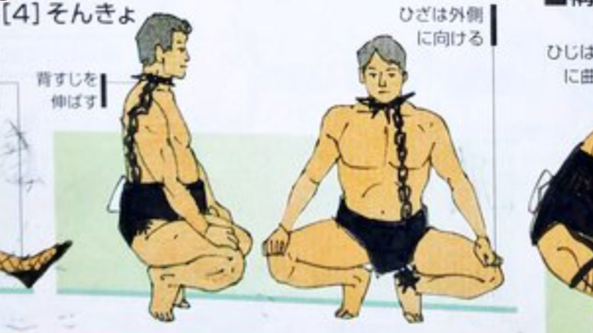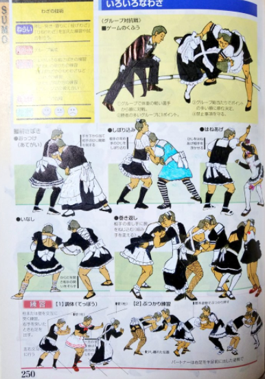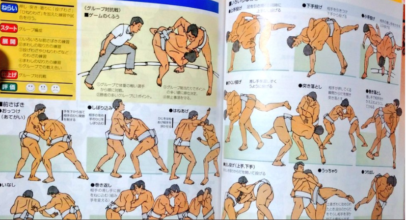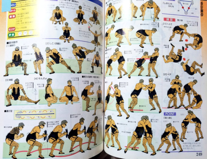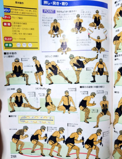 このページでは、ボンデージ姿で四股を踏んだり受け身を取る男たちの姿も。地下の秘密クラブ的な雰囲気を感じます。教科書に似つかわしくなさすぎます。