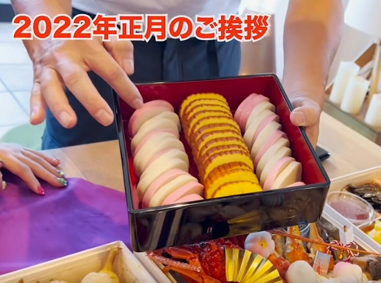 YouTube動画内で披露した「うちのお重」これを準備したのは妻の伊代さん。かまぼこメインというかなり斬新なお重は制作時間1分だとか。ヒロミさんは「よく見てください。かまぼこちゃんと切れてないでしょ。紅白もバラバラ」と笑顔で説明する場面も。